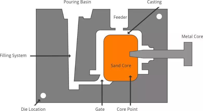 - As the metallic mold is airtight, measures must be taken to direct air out of the mold cavity and the gases out of the sand core.